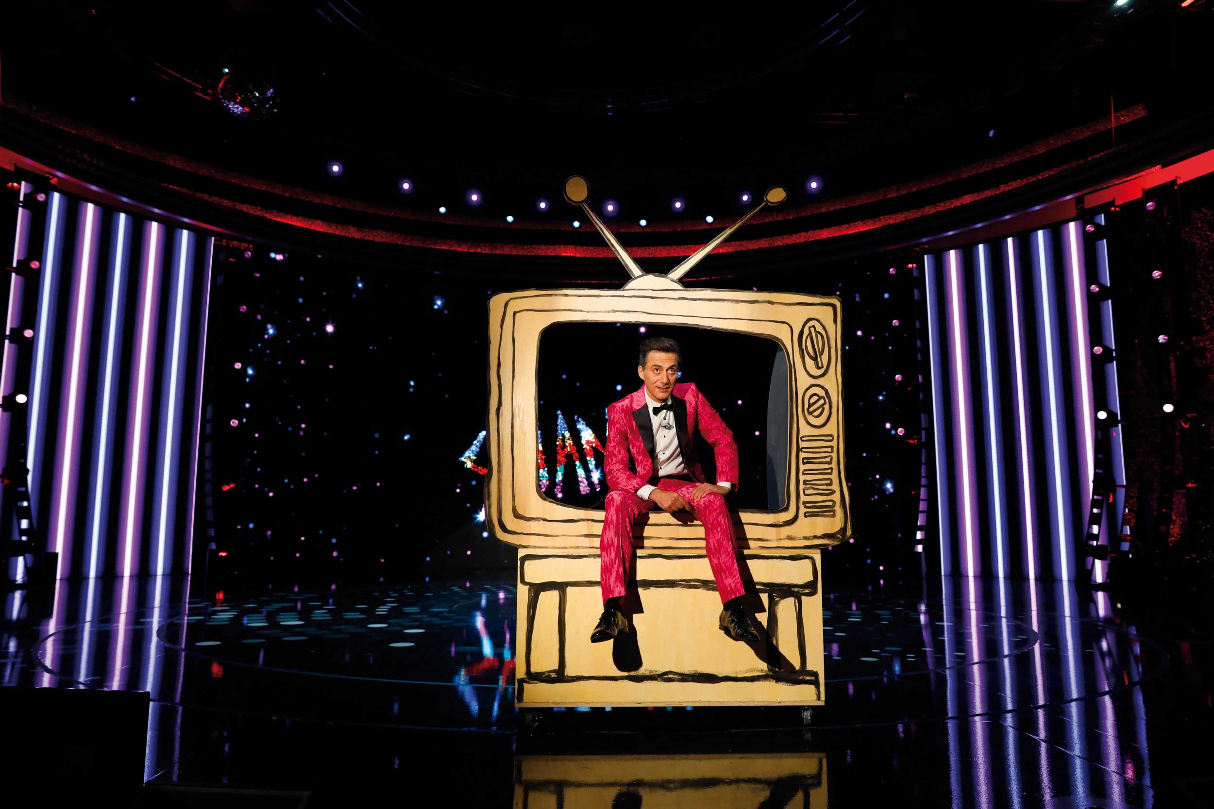 L’idea è nata dal mio omonimo spettacolo teatrale, Skianto, e dal mio desiderio di raccontare due grandi appuntamenti tv, il Festival di Sanremo e lo show del sabato sera, in modo ironico e divertente, senza un ordine cronologico, ma regalando contemporaneità ed emozioni. In quella magica scatola che è la televisione trasferisco il mio personaggio teatrale. È nato con la scatola cranica sigillata, però sul piccolo schermo, come per miracolo, riesce a esprimersi. Perché la tv arriva davvero dappertutto e si accende in ogni casa italiana, è una di famiglia. E per me, cresciuto negli anni ’80, è un’enciclopedia. I miei pomeriggi, una volta finiti i compiti, li passavo in compagnia di questa finestra sul mondo. Chi appare in tv è spesso vicino alle nostre foto del matrimonio o di altri bei momenti. I suoi personaggi stanno in salotto con noi.