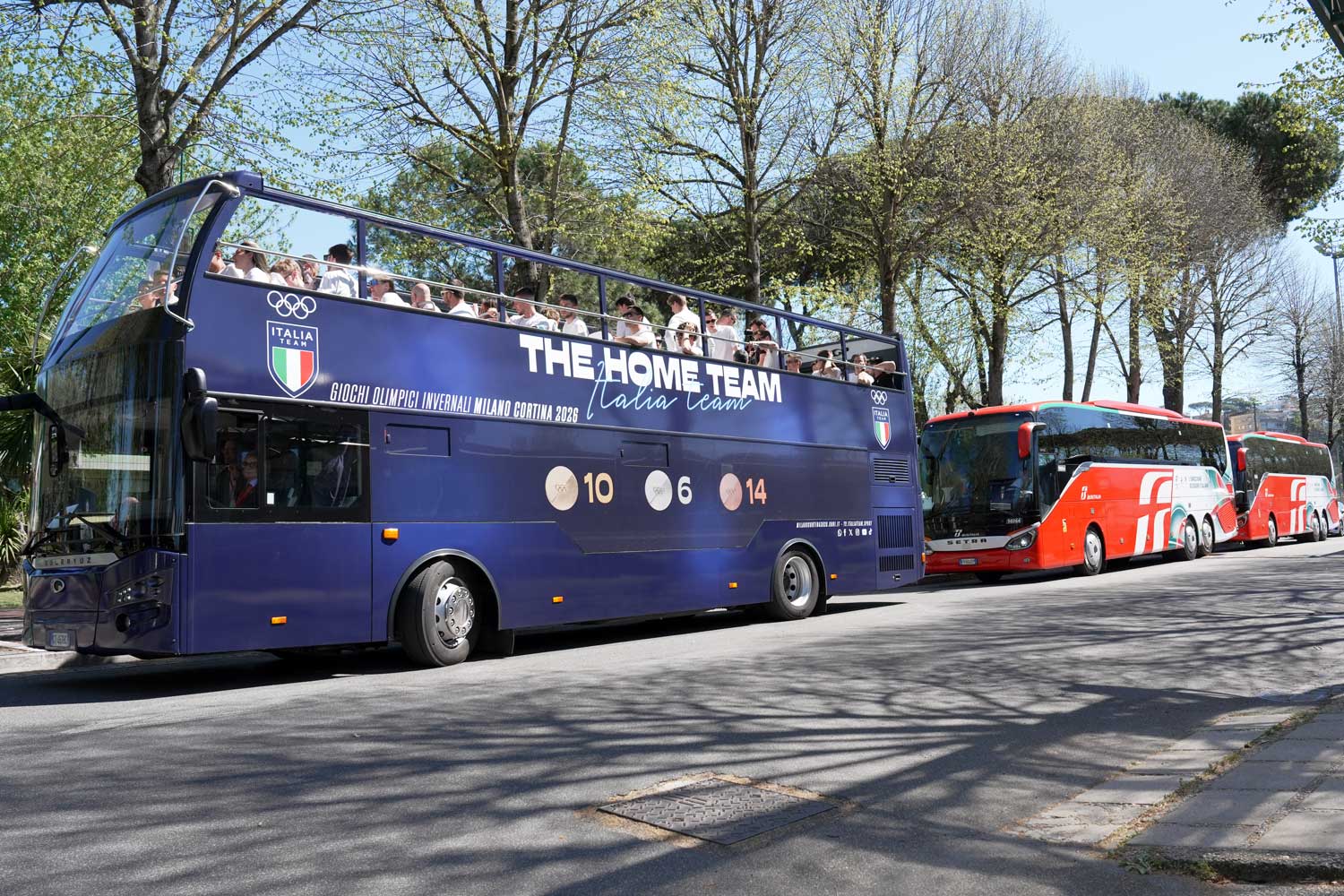 Per l’occasione, Busitalia ha messo a disposizione un open bus destinato al trasferimento degli atleti medagliati, livreato con la grafica “Italia team” per evidenziare il carattere celebrativo della manifestazione. Due altri bus gran turismo con livrea dedicata “Look of the games” sono stati impiegati per il trasporto dello staff. Busitalia, inoltre, garantirà il trasferimento della delegazione alla visita ufficiale in Vaticano per l’incontro con Papa Leone XIV il 9 aprile.