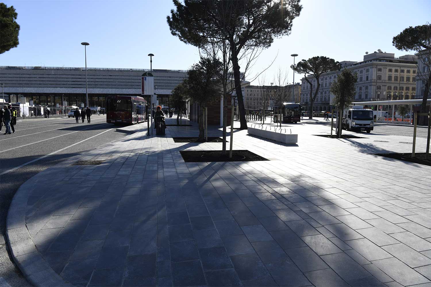 Roma Termini è il più importante scalo ferroviario di Roma, il più grande d’Italia in termini di traffico e tra i principali d’Europa. Il cantiere diffuso ha riguardato la riqualificazione e sistemazione superficiale di tre aree per un importo di 45 milioni di euro e 540 giorni di lavoro. Gli interventi riguardanti il solo perimetro di Piazza dei Cinquecento, un’area di 45mila mq, sono stati avviati il 9 ottobre 2023, per un importo di circa 21 milioni di euro.