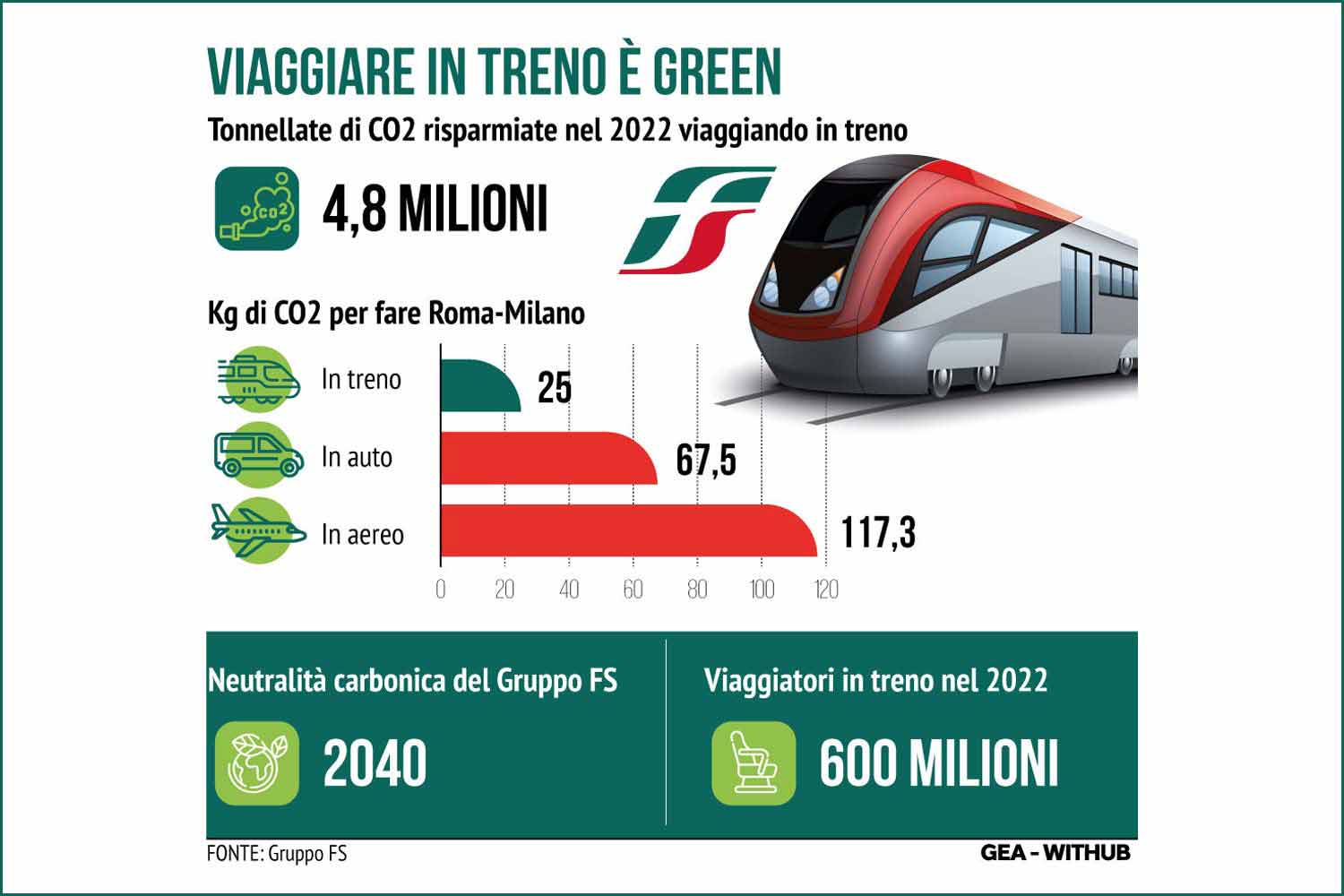 Un risparmio reso ancora più evidente se si pensa che un viaggiatore per andare da Roma e Milano produce 25Kg di CO2, 67,5 Kg di CO2 viaggiando in macchina e ben 117,3 Kg di CO2 prendendo l’aereo. Ecco perché il Gruppo FS vuole incoraggiare e sostenere sempre più il cosiddetto shift modale. E per farlo il Gruppo guidato da Luigi Ferraris ha posto la sostenibilità come valore centrale del suo ultimo Piano Industriale 2022-31, puntando a raggiungere la neutralità carbonica entro il 2040, ben 10 anni prima dell’obiettivo fissato dall’UE